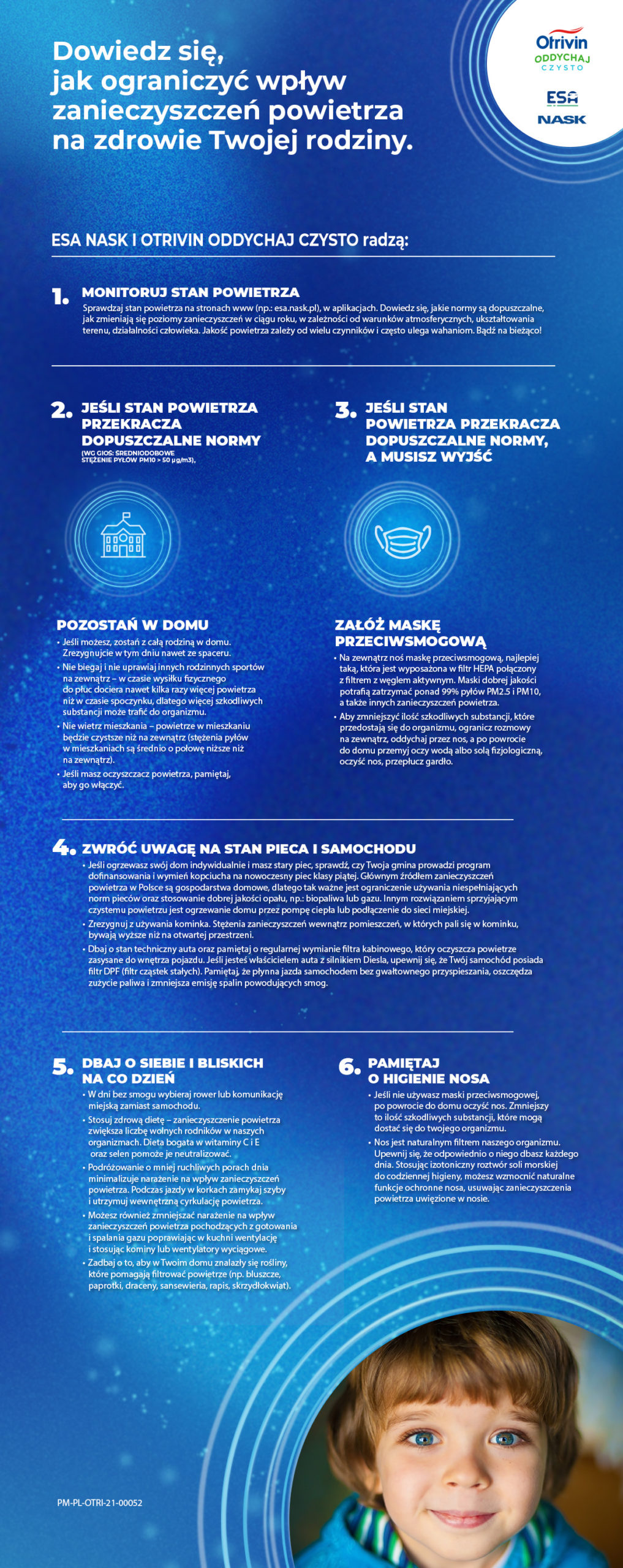 – Szkoły, jako instytucje kształcące dzieci i młodzież oraz ważne ośrodki opiniotwórcze, są doskonałym miejscem, by to w nich właśnie upowszechniać wiedzę na temat zanieczyszczenia powietrza i jego skutków dla zdrowia. Nasz przekaz kierujemy zarówno do dzieci, jaki i dorosłych – nauczycieli i rodziców. W ten sposób pomagamy całym lokalnym społecznościom w dostrzeżeniu i zrozumieniu problemów mających wpływ na jakość życia – mówi Barbara Leśniczak, z Państwowego Instytutu Badawczego NASK, partnera merytorycznego kampanii, który od lat realizuje program dla szkół Edukacyjna Sieć Antysmogowa. – Scenariusze lekcyjne oraz porady dla dzieci, nauczycieli i rodziców, przygotowane w ramach kampanii „Pomóżmy Dzieciom Oddychać Lepiej” zainicjowanej przez Otrivin Oddychaj Czysto, pomogą w łatwy i przystępny sposób przekazać wiedzę na temat zanieczyszczenia powietrza, które według WHO stanowi największe zagrożenie środowiskowe dla naszego zdrowia. Początek roku szkolnego to idealny moment na tego typu działania. Dzięki temu nauczyciele i rodzice będą mogli odpowiednio przygotować się na czas, kiedy stężenia smogu są największe, czyli sezon grzewczy – dodaje ekspertka.