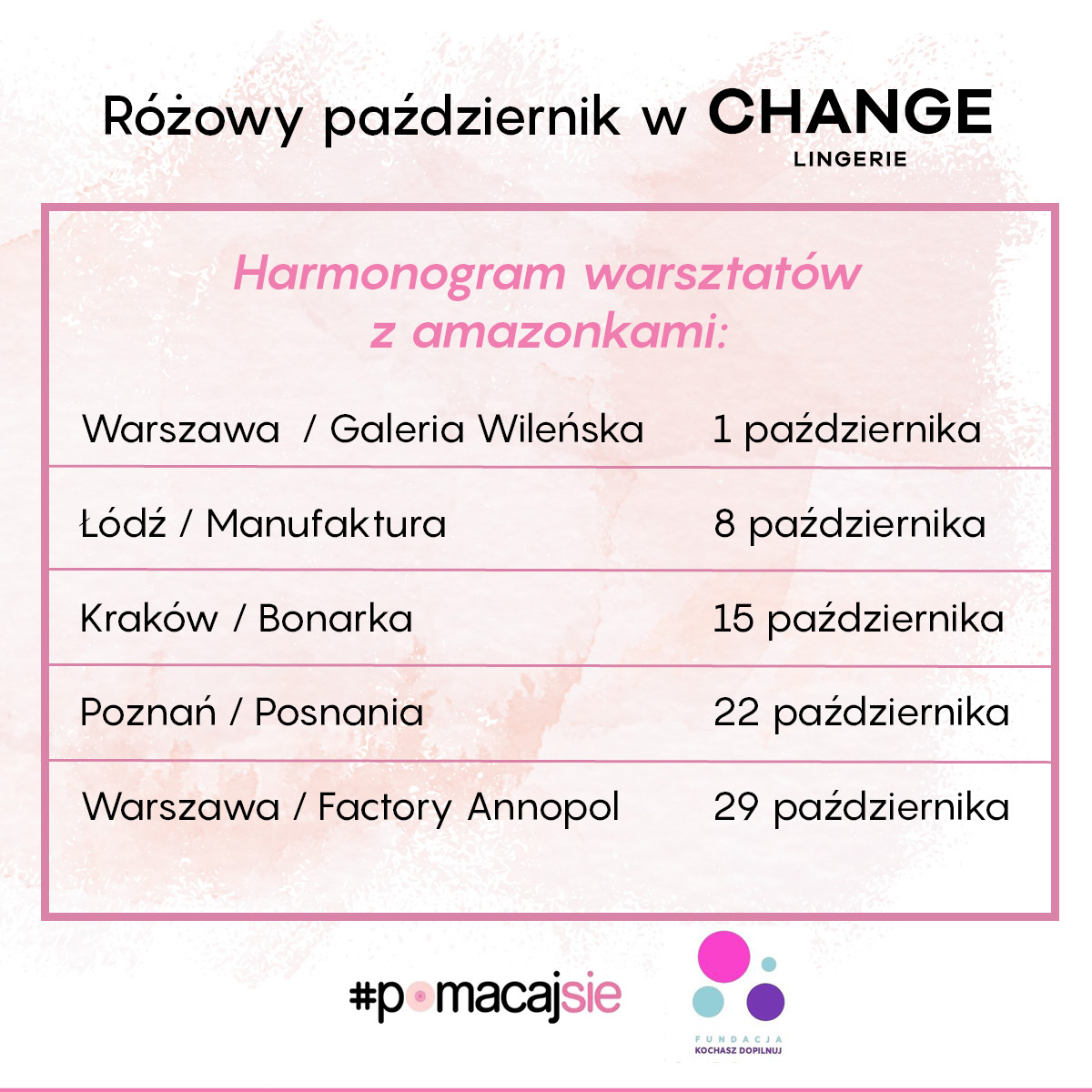 Według szacunków w Polsce dałoby się uratować rocznie dwa i pół tysiąca kobiet, które zos-tały zdiagnozowane zbyt późno. To zatrważająca statystyka, którą za wszelką cenę należy odwrócić. W październiku przyłączamy się do misji szerzenia wiedzy na temat profilaktyki raka piersi oraz zachęcania kobiet do samobadania piersi. Prócz warsztatów z amazonkami (na które serdecznie zapraszamy), przez cały miesiąc we wszystkich salonach CHANGE będziemy dystrybuować materiały edukacyjne przygotowane przez fundację, a lustra w naszych przymierzalniach wyposażyliśmy w graficzną instrukcję samobadania – mówi Mar-celina Zięciak, PR Manager CHANGE w Polsce.